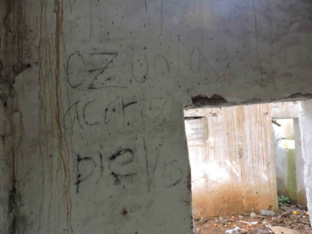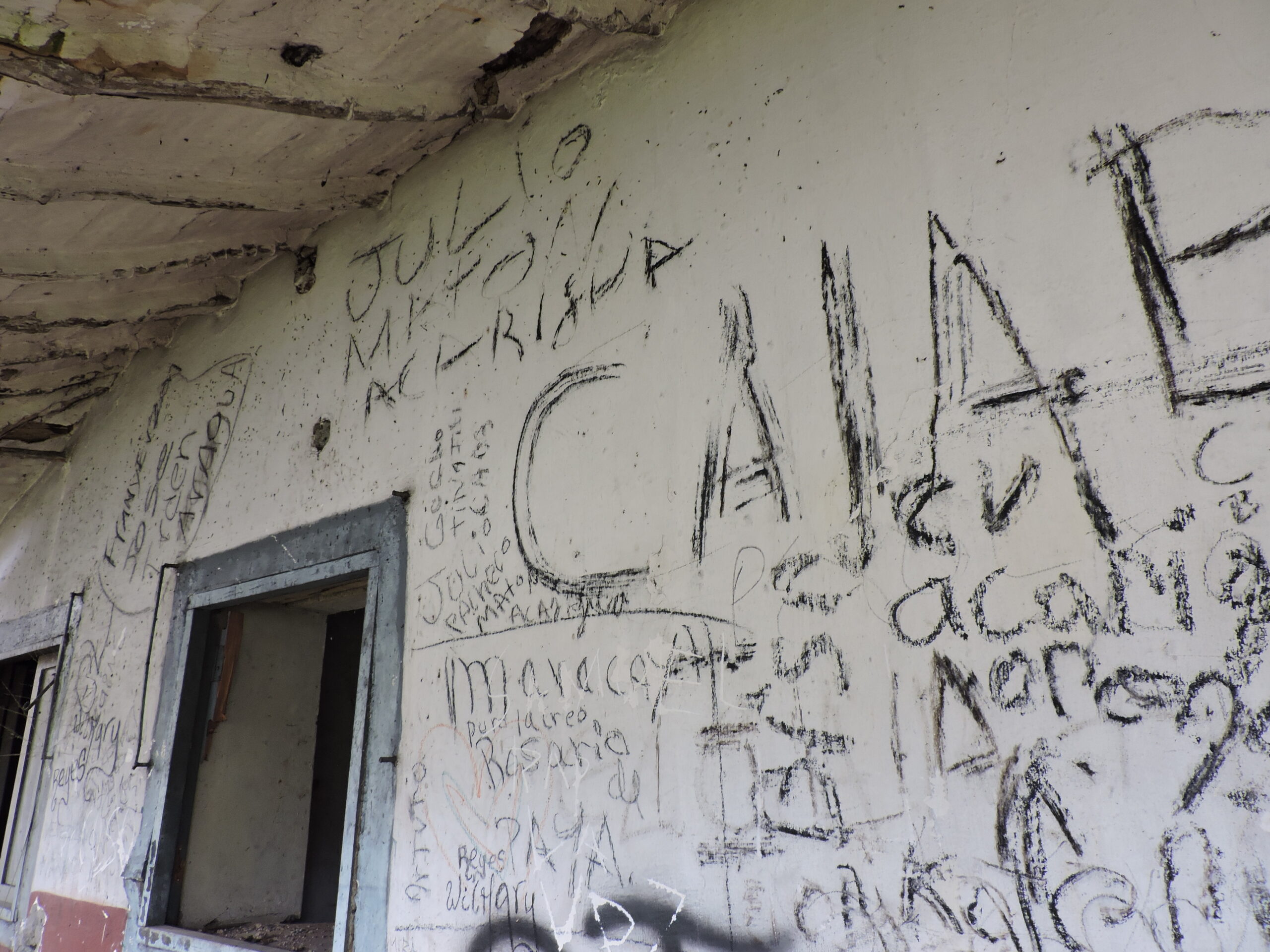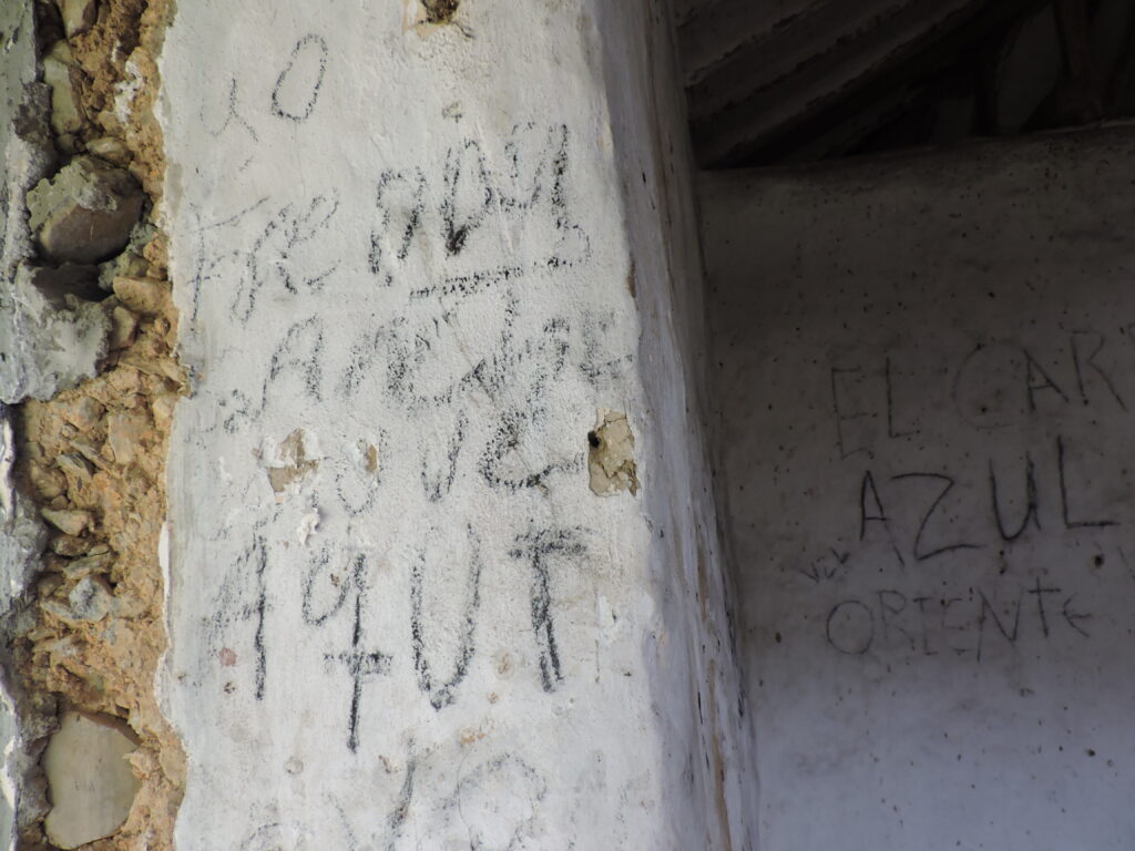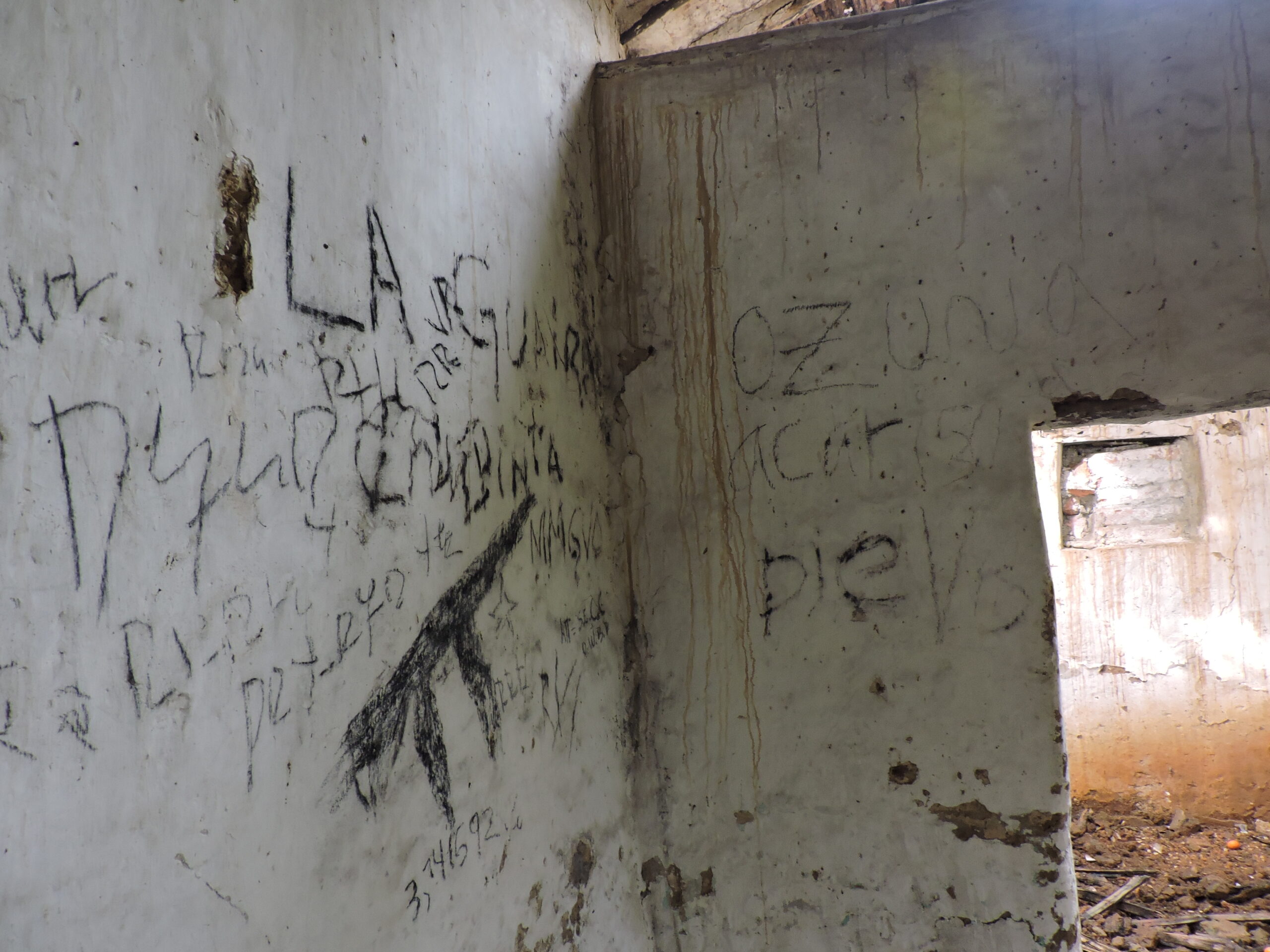 En las paredes principales de la casa —en la fachada y en lo que pudo ser una sala— se concentra la mayor cantidad de mensajes. Su densidad transforma el espacio y genera una atmósfera cargada de dramatismo, distinta a la observada en otros lugares de la carretera.